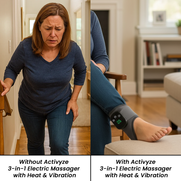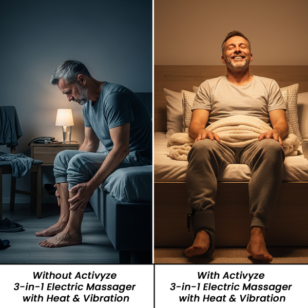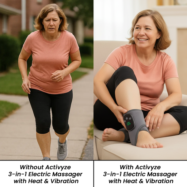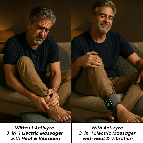 The Activyze 3-in-1 Electric Massager with Heat & Vibration outperforms traditional foot and leg massagers with its triple-action therapy (heat, compression, and vibration), portable cordless design, and lasting relief. It makes daily recovery easier, faster, and more effective, so you can feel the difference in just 15 minutes.